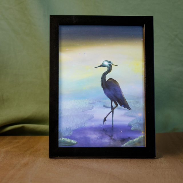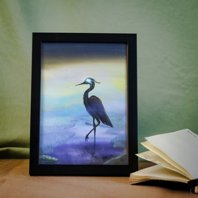 Illustration imprimée d’un héron dans les marais – ambiance féerique et onirique et son Poème ✨