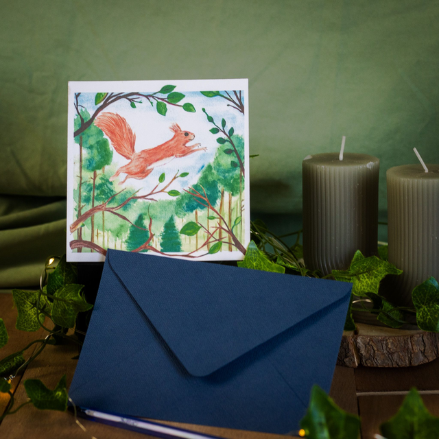 Carte postale illustrée d’un écureuil roux bondissant entre les branches – une scène douce et lumineuse inspirée de la nature. 🍂